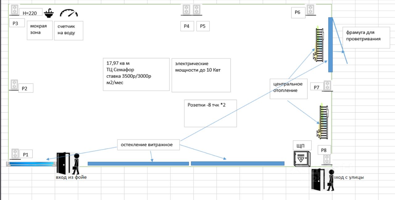 - площадь - 17.97 метров -остекление - с фойе и улицы (витражи) -Открывающиеся окна - да (фрамуга) -входы - 2 шт ( с парковки и центрального входа в ТЦ) -мокрая точка - 1 -Электричество - до 12 КВТ -Отопление -центральное -Отделка - офисная -Потолок- подвесной -Пол -кафель плитка -Свет-свето-диодные светильники -место для рекламы на фасаде ТЦ - да -место для вывески на внутреннем фасаде -да -Санузел для сотрудников - да ( в тц общий) -Доступ к помещению 24/7 с 8-00 до 22-00